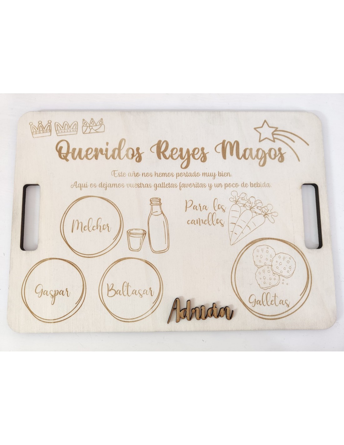 Bandeja de madera con un bonito diseño grabado, ideal para dejar unos dulces detalles a los Reyes magos para que repongan fuerzas.