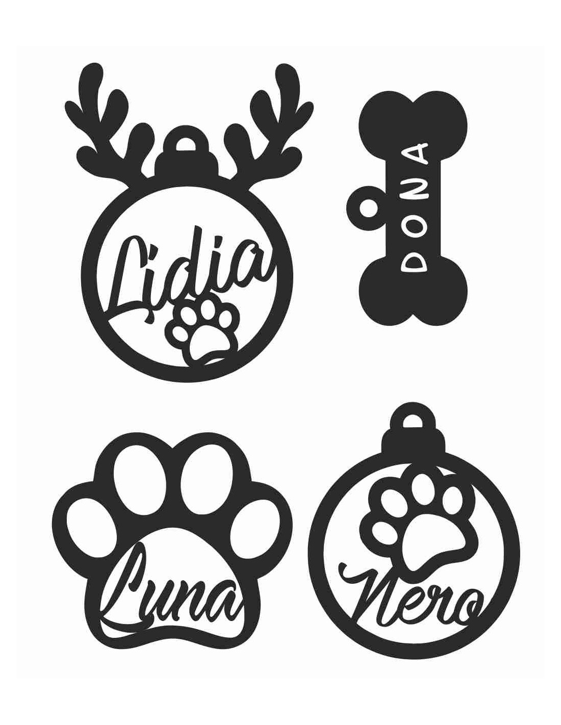 El set incluye 4 adornos variados con huesos y huellas de mascotas.