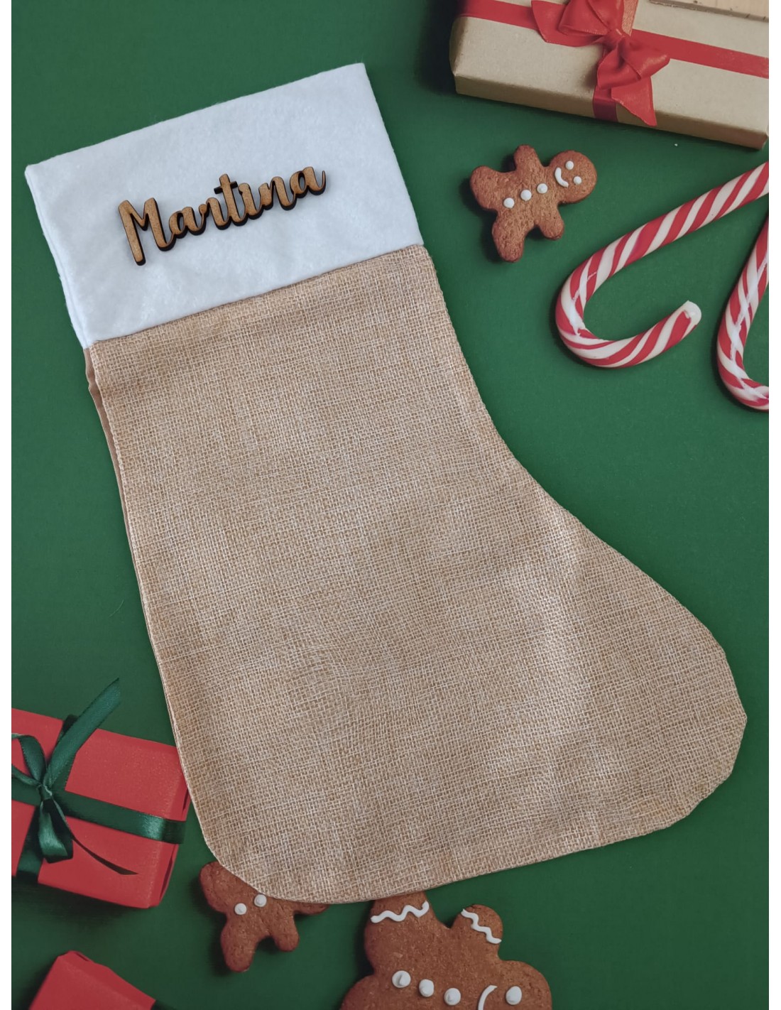 Nuestro calcetín personalizado navideño viene con una cinta que facilita su colocación. Además cuenta con capacidad para introducir en su interior regalos que no ocupen mucho volumen. Fabricado en poliéster en colores natural y blanco.