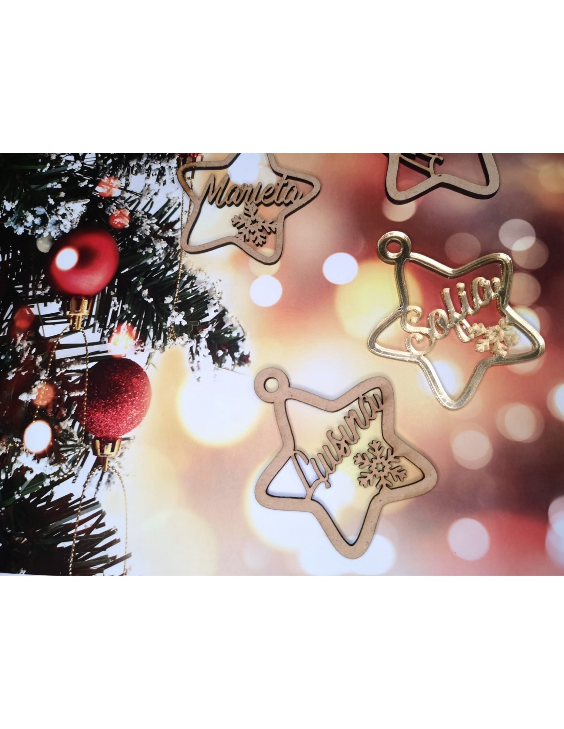 Este adorno está elaborado en madera DM o metacrilato de 3 mm. Decorar el árbol de manera original ahora es facilísimo con estos adornos de Navidad personalizados.