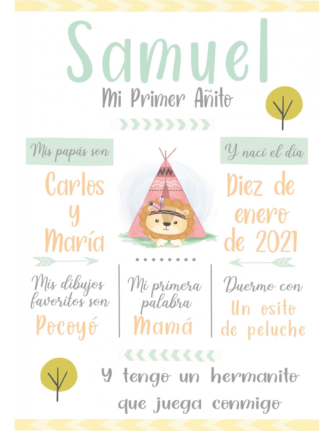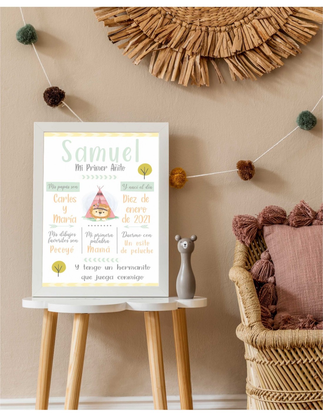 Lámina de Mi Primer Añito personalizada indio. Elige este bonito diseño de lámina para decorar vuestro hogar y tener un precioso recuerdo de su primer cumpleaños.