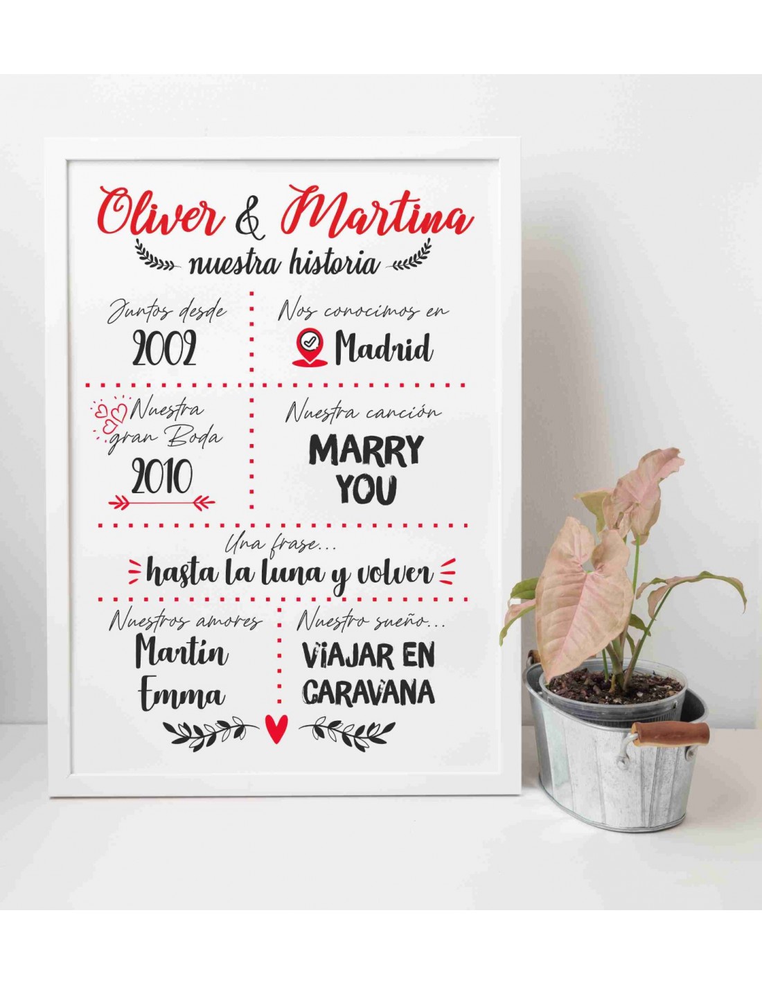 Lámina "Nuestra historia de Amor" personalizada. Elige este romántico diseño de lámina para decorar vuestro hogar y tener un precioso recuerdo con vuestros momentos más importantes.