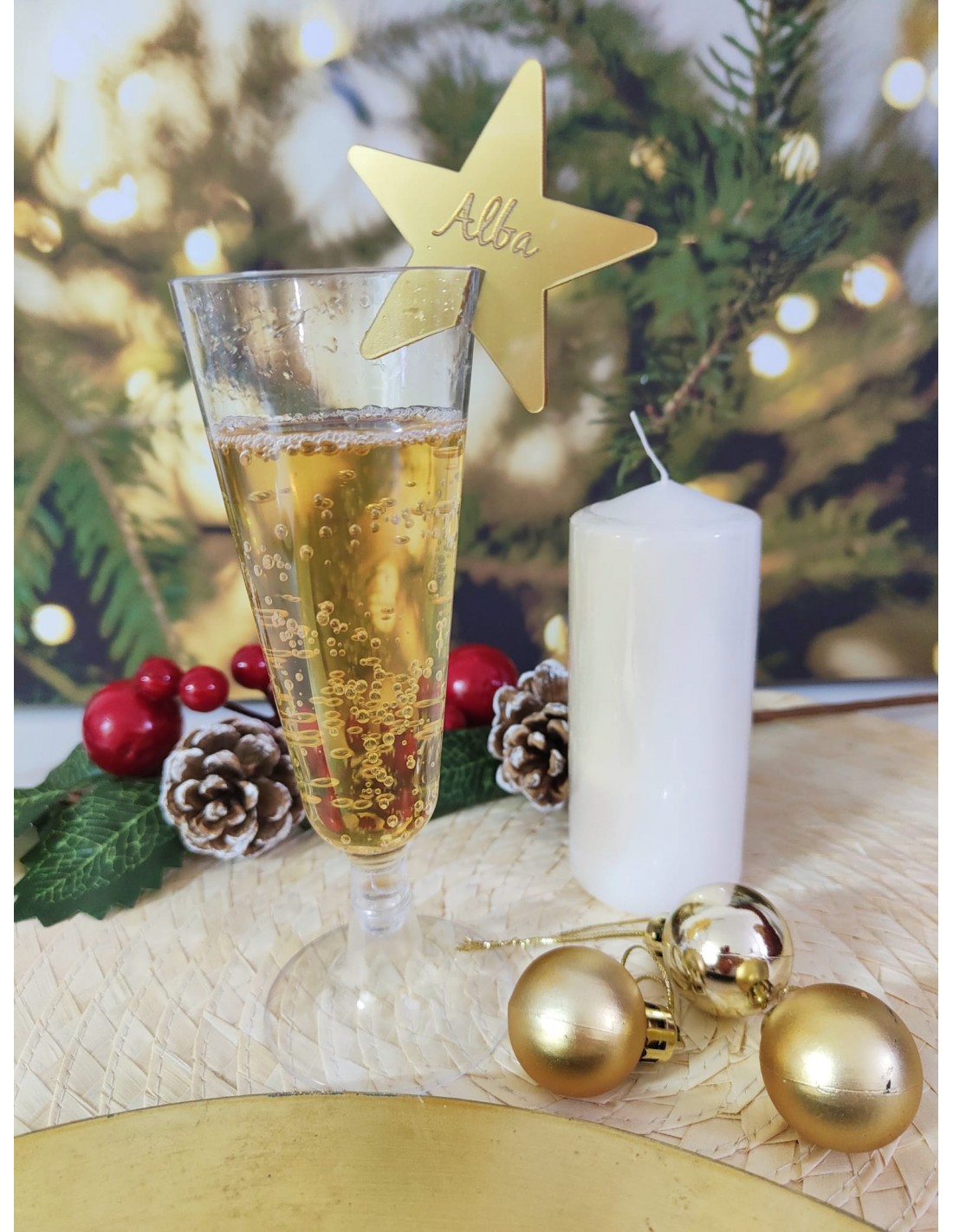 Marcasitios fabricados en acrílico dorado, con un bonito diseño con forma de estrella, para organizar los sitios de tus invitados en las celebraciones de Navidad.