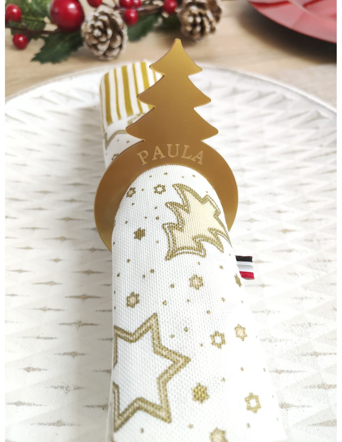 Servilletero marcasitios con diseño de Abeto personalizado con el nombre, ideal para decorar la mesa estas Navidades y que cada uno tenga su lugar en la mesa. Un detalle único con tus invitados.