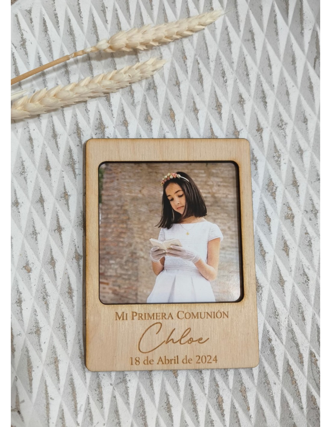 Portafotos de madera estilo Polaroid para entregar como recuerdo de Primera Comunión a familiares y amigos.