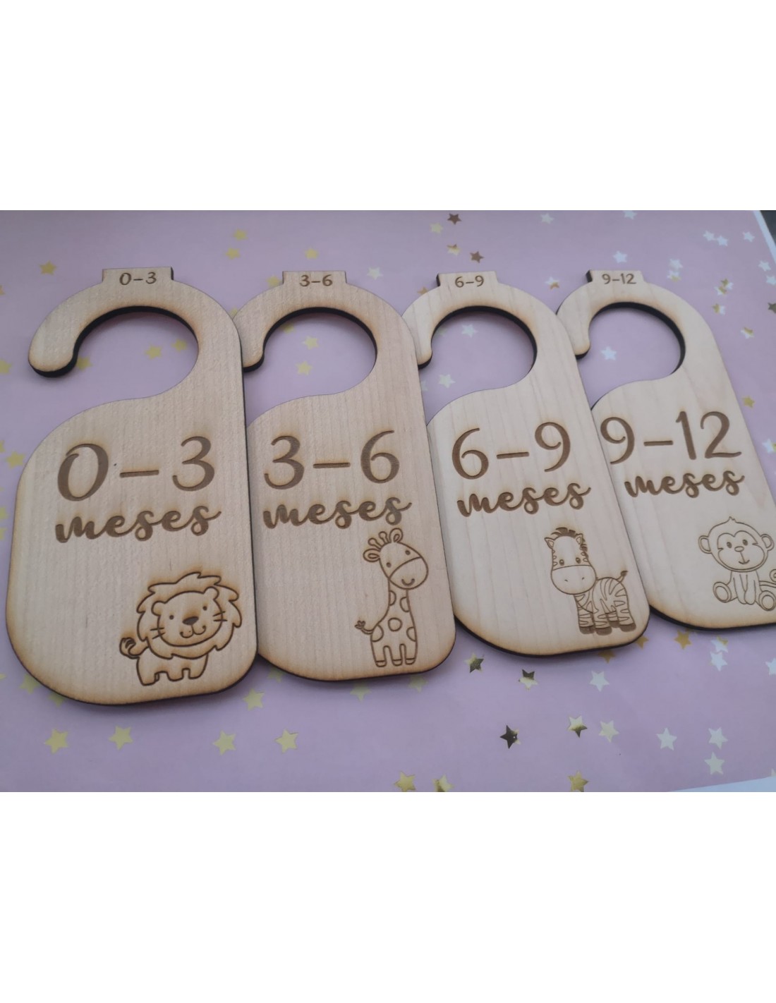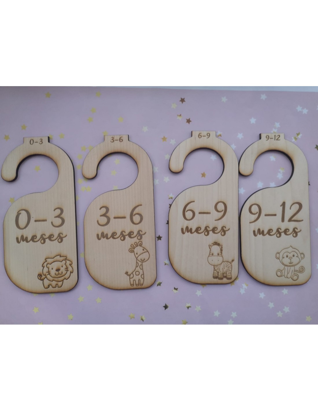 Set de 4 organizadores de armario grabados en madera con diseño de animales, ideales para separar la ropita de bebé por meses.
