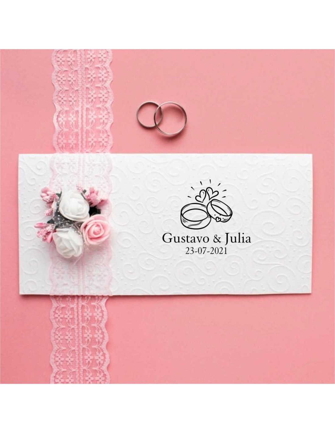 Sello de boda personalizado con vuestros nombres y una preciosa imagen de alianzas. Una opción perfecta para marcar cualquier detalle de vuestra boda.