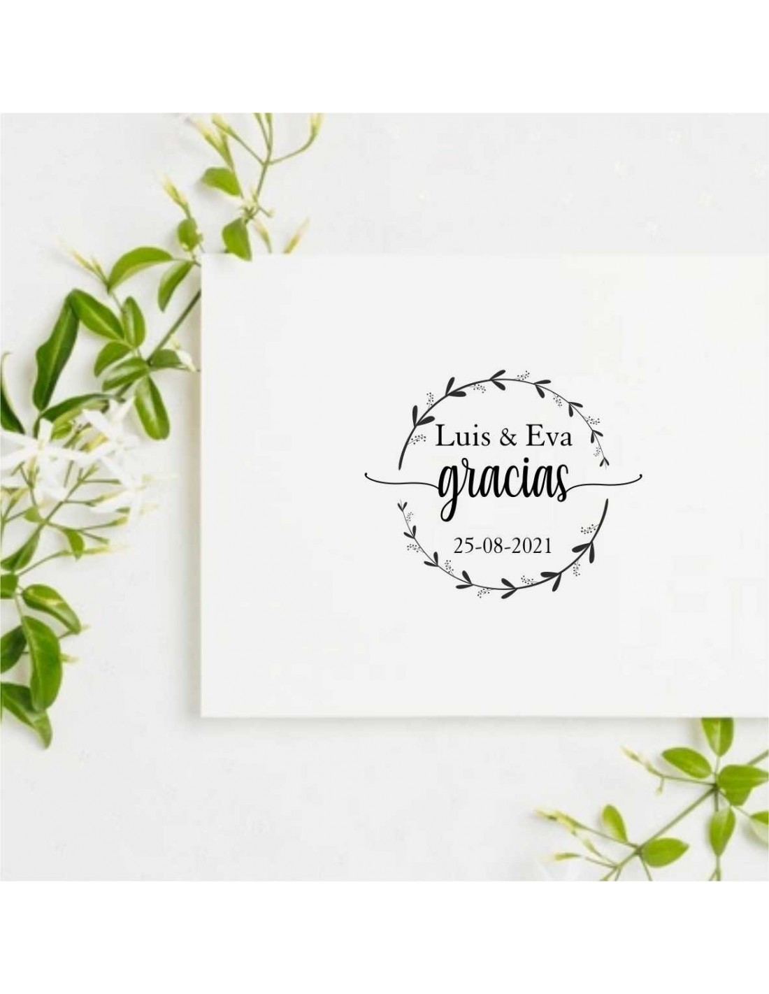 Sello de boda personalizado con vuestros nombres y fecha de boda, y la palabra Gracias. Una opción perfecta para marcar cualquier detalle de vuestra boda.