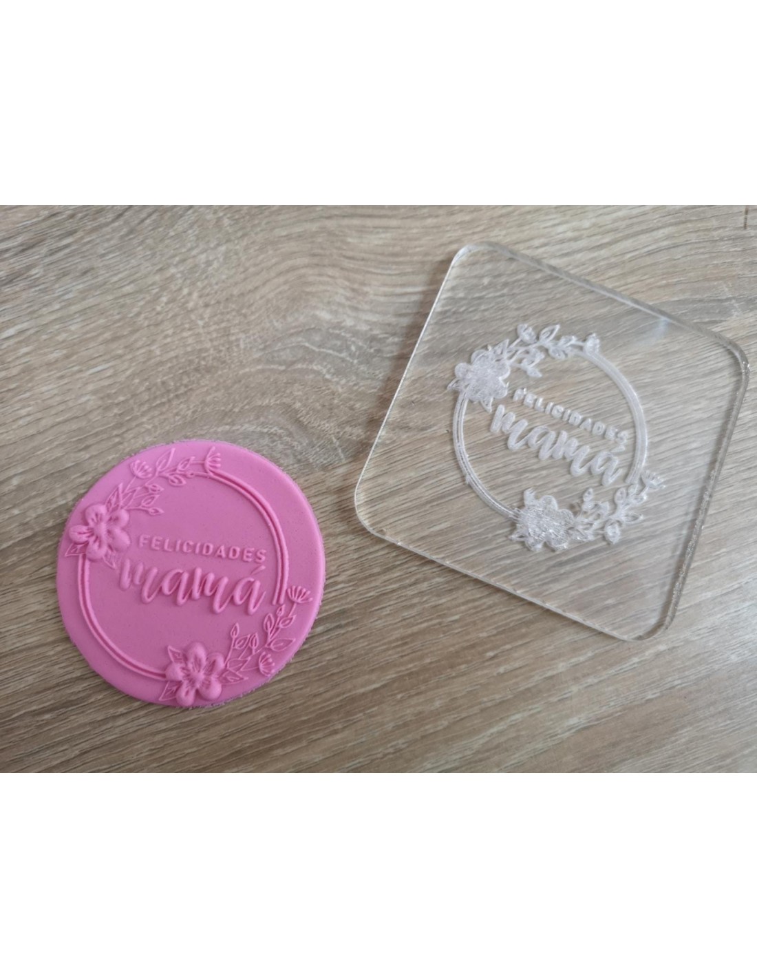 Con este sello podrás hacer preciosas galletas con el mensaje "Felicidades mamá" ideal para regalar galletas a esas madres tan geniales que se lo merecen todo. El mensaje queda en relieve. Este sello no corta el fondant, solo lo marca. No tiene mango.