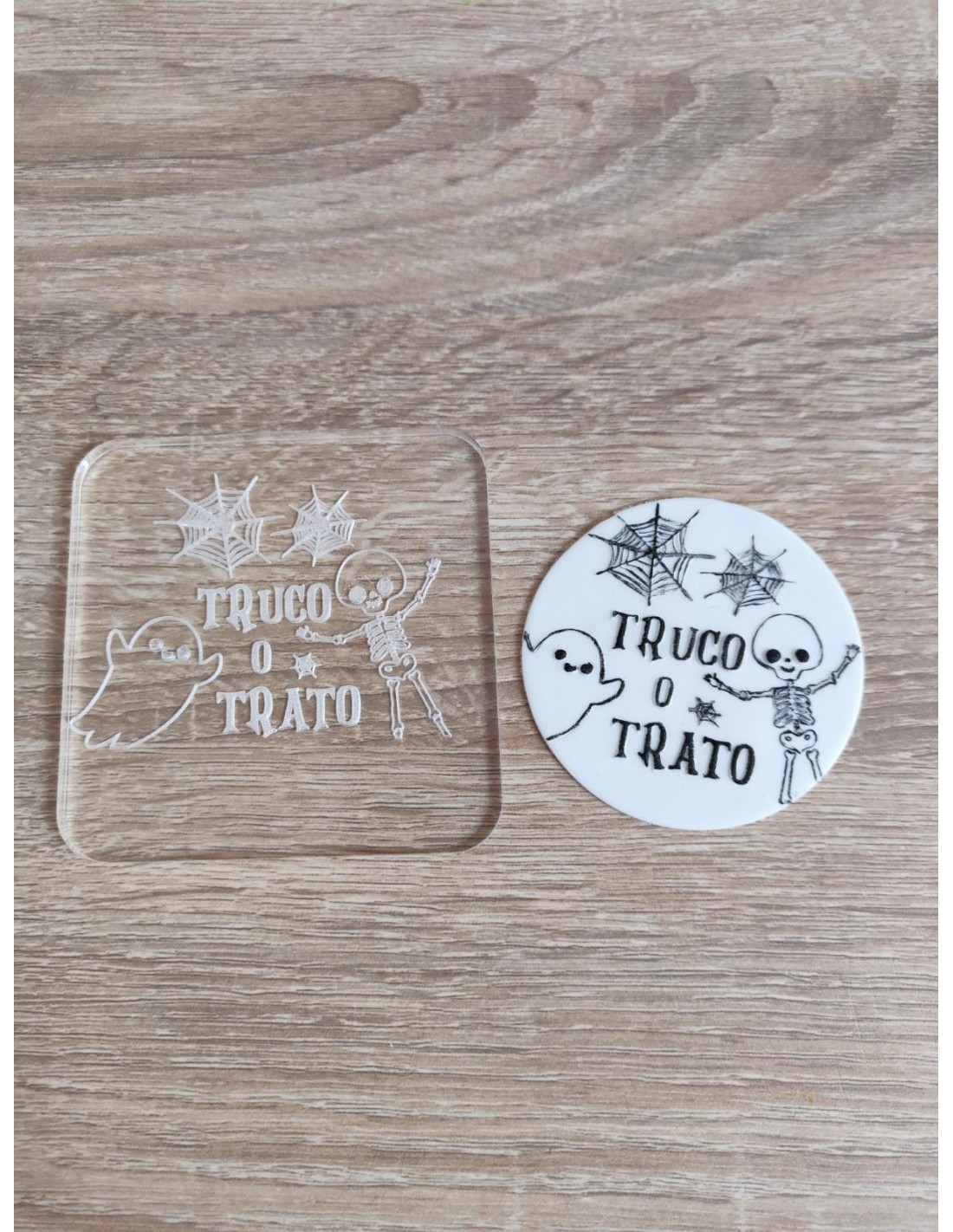 Con este sello podrás hacer terroríficas galletas con el mensaje "Truco o Trato" ideal para regalar galletas. El mensaje queda en relieve. Este sello no corta el fondant, solo lo marca. No tiene mango.